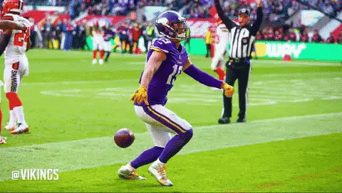 Adam Thielen, wearing his Vikings jersey number 19, celebrates on the football field after a play.