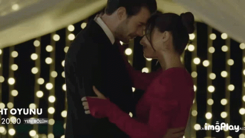 Ada and Bora share a tender embrace in a romantic setting, illuminated by string lights, from the show Adbor Bathoyunu.