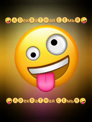 Animated yellow emoji with a pink tongue sticking out, featuring the text 'Adequate Family' in Russian.