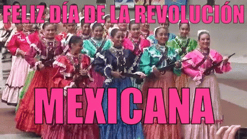Adelitas celebrate the Mexican Revolution, dressed in traditional costumes and holding prop rifles.