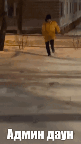 Man in yellow jacket runs in snow, then turns to camera, with 'Admin daun' text displayed.