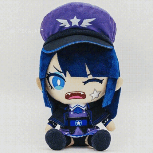 Ado plush doll with blue hair and purple hat gets a gentle poke on its face, showcasing its soft texture.