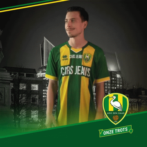 Thom Haye, wearing an ADO Den Haag FC jersey, makes a 'Gotcha' gesture, representing 'Our Pride'.