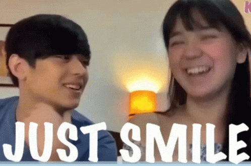 Mikee Quintos and Kelvin Miranda share a joyful moment, smiling for the camera with 'JUST SMILE' text.