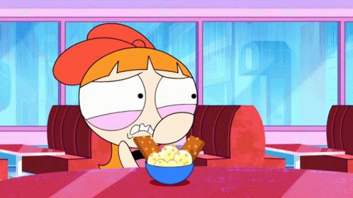 Blossom from The Powerpuff Girls looks distressed and nervous while eating a bowl of food, then winks.