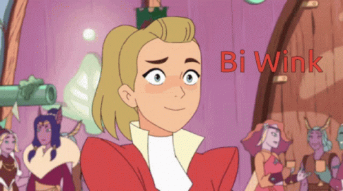 Adora from She-Ra winks and smiles, with 'Bi Wink' text overlaid, referencing her identity.