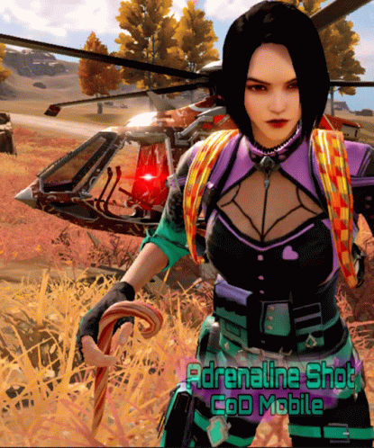 A female character in Call Of Duty Mobile uses an Adrenaline Shot before boarding a helicopter in a vibrant outdoor setting.