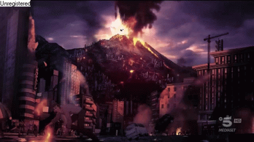 Animated scene from Adriano Celentano's 'Adrian' show, depicting a dramatic volcano eruption over Naples.