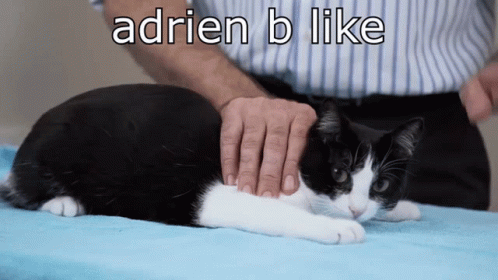 Adrien the tuxedo cat enjoys being petted, embodying the 'Adrien B like' meme with a relaxed demeanor.