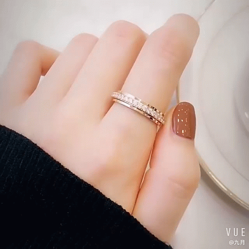 A close-up view of a hand showcasing a sparkling ring with multiple rows of diamonds, set against a light background.