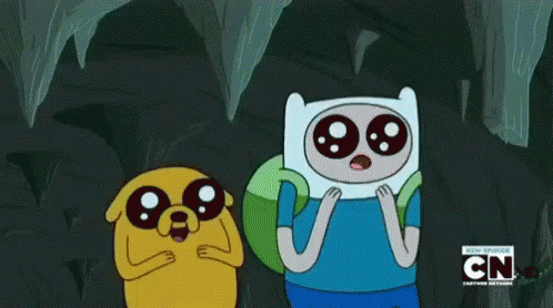 Finn and Jake from Adventure Time with adorable big, sparkling eyes in a cave setting.