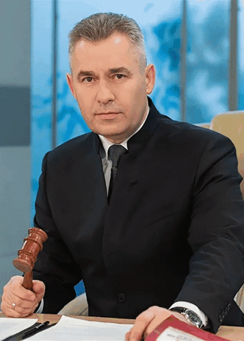 Павел Астахов, адвокат и телеведущий, держит молоток судьи во время передачи Час суда.