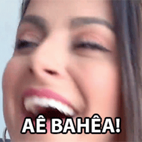 Nah Cardoso smiles brightly with the text 'AÊ BAHÊA!' overlaid, capturing a happy, dreamy moment.