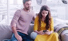 Anushka Sharma and Ranbir Kapoor share a tender moment on a couch, with Ranbir embracing Anushka as she looks at her phone.
