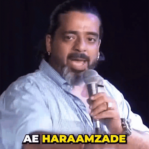 Comedian Jeeveshu Ahluwalia on stage, holding a microphone and saying 'Ae Haraamzade'.