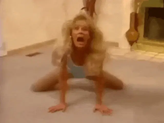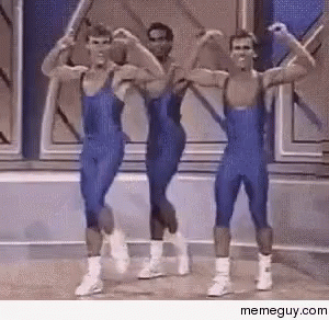 Three men in blue leotards perform aerobics, with the 'Deal With It' text appearing as a meme.