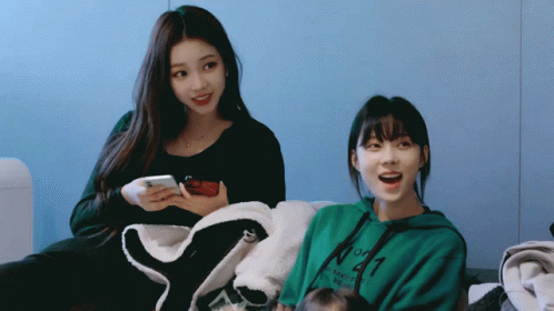 Aespa's Karina and Winter chatting and smiling, with Winter wearing a green hoodie and gesturing.