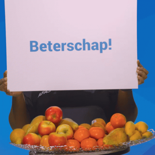 A woman from AFAS presents a 'Get Well Soon' fruit basket, taking a bite from an apple.
