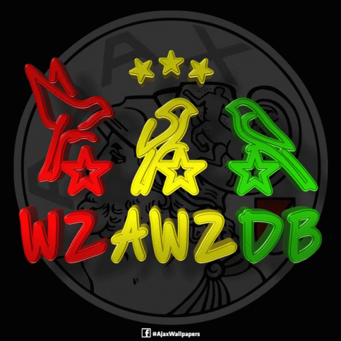 Animated 3D logo for Afca Ajax featuring red, yellow, and green letters WZAWZDB, birds, and stars.