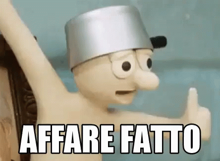 A claymation character with a bucket on its head gives a thumbs up, with the text 'Affare Fatto' (Deal Done).