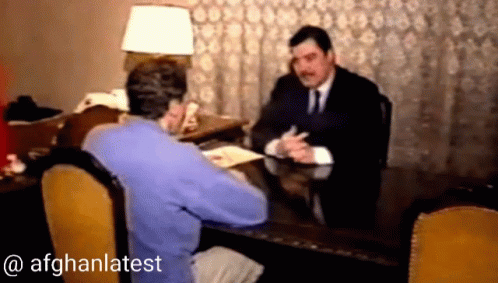 Mohammad Najibullah, former Afghan President, in a meeting in Kabul, smiling and talking to another man.
