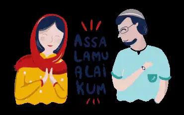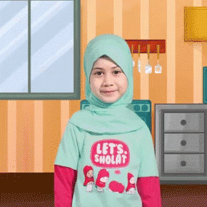A young girl wearing a hijab and an 'Afrakids Let's Sholat' shirt smiles, promoting prayer in a cartoon kitchen.