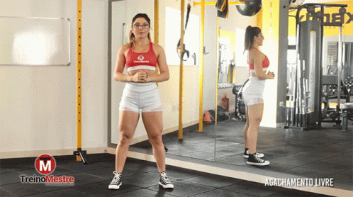 Woman demonstrates a free squat (agachamento livre) in a gym, part of Treino Mestre workout.