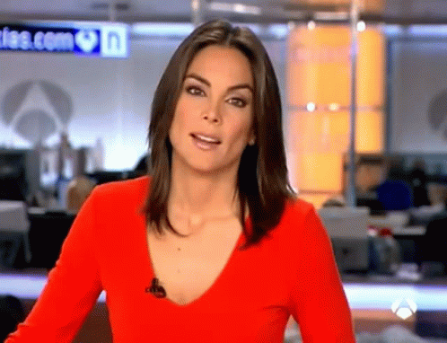 A news anchor in a red shirt delivers the 'Noticia Sin Importancia' (unimportant news) on a Spanish broadcast.