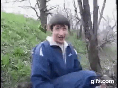 Young man in blue tracksuit and beanie smiles and gestures in a wooded outdoor setting.