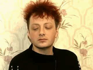 Gleb Samoylov of Agata Kristi with red, spiky hair, sitting in front of a floral wall.