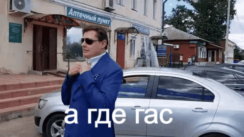 Поносенков, dressed in a blue suit, asks 'And where is gas?' in front of a pharmacy.