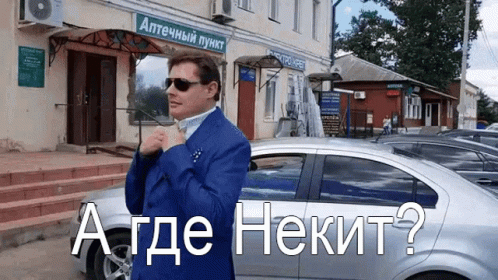 Ponasenkov asks 'And where is Nekit?' while standing in front of a Russian pharmacy.