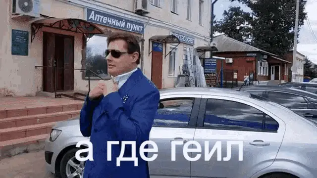 Ponasenkov in a blue suit asking 'And where is Papov?' outside a pharmacy in Russia.