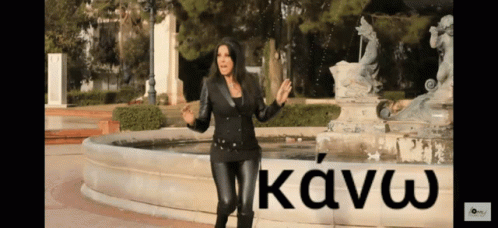 Agela Dimitriou performs in front of a fountain, with Greek text 'κάνω' and 'BACK' appearing on screen.