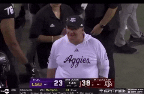 Coach Mike Elko of Texas A&M Aggies reacts excitedly during a football game against LSU.