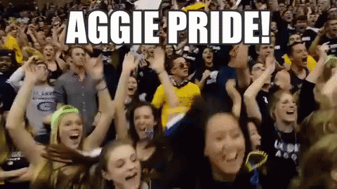 A crowd of enthusiastic fans cheering and raising their hands, displaying "Aggie Pride!" at a sporting event or gathering.