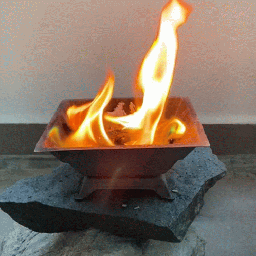 Agnihotra O Homa, a sacred fire ritual, burning brightly with dancing flames in a metal container.