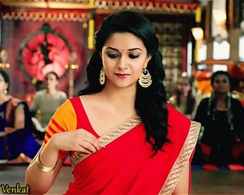 Keerthi Suresh in a stunning red saree from Agnyaathavaasi, showcasing her elegant look.