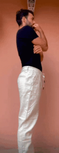 Agoney poses as a model, wearing a black shirt and stylish white pants against a plain pink background.