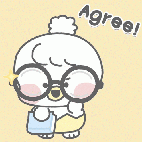 Cute cartoon chick Piyomaru, wearing glasses and holding a bag, expresses agreement with 'Agree! 賛成'.