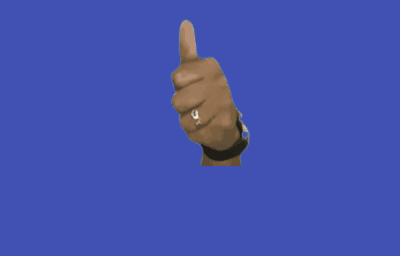 A hand with a ring gives a clear thumbs up gesture on a solid blue background, signifying agreement.
