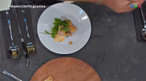 A chef carefully adds condiments to a beautifully plated dish on Master Chef Argentina, enhancing its flavor.
