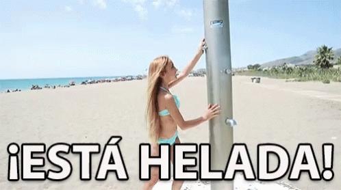 Silvia Sanchez reacts to freezing cold water from a beach shower on a sunny day.