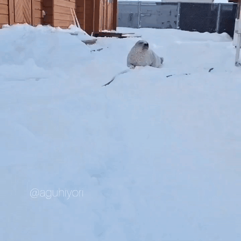 Aguhiyori Agu Seal waddling adorably through fresh snow towards the camera.