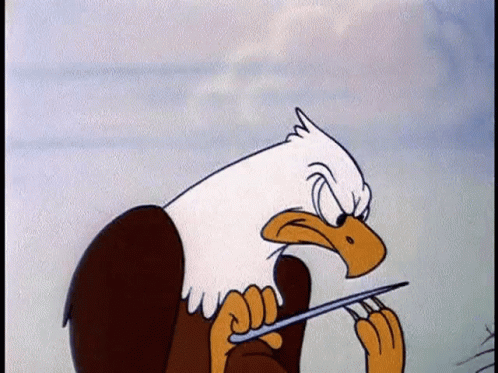 An animated bald eagle sharpens its talons on a stick.