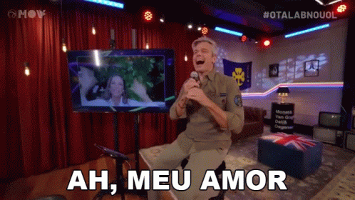 Otaviano Costa, holding a microphone, says 'Ah Meu Amor' while sitting in front of a TV screen.
