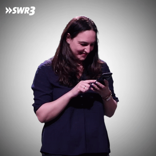 Simone Sarnow reacts with exaggerated laughter to something hilarious on her phone, pointing and bending over in amusement.