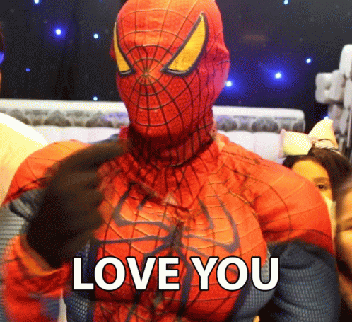 Mr Shekles as Spiderman makes a heart gesture with 'LOVE YOU' text, expressing affection.