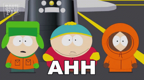 Eric Cartman screams 'Ahh!' while Kyle Broflovski and Kenny McCormick look on in South Park.