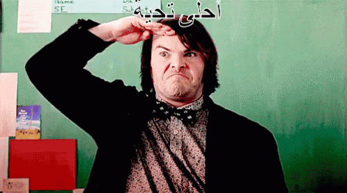 Jack Black performs a humorous military salute with a funny expression in front of a green board.
